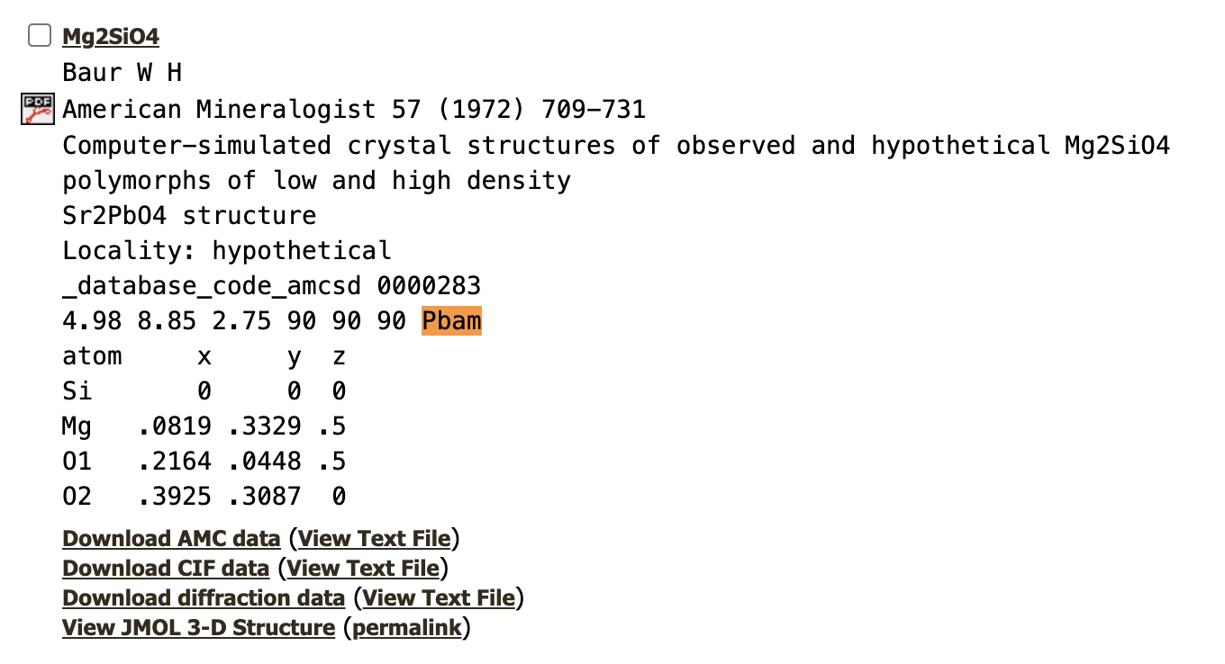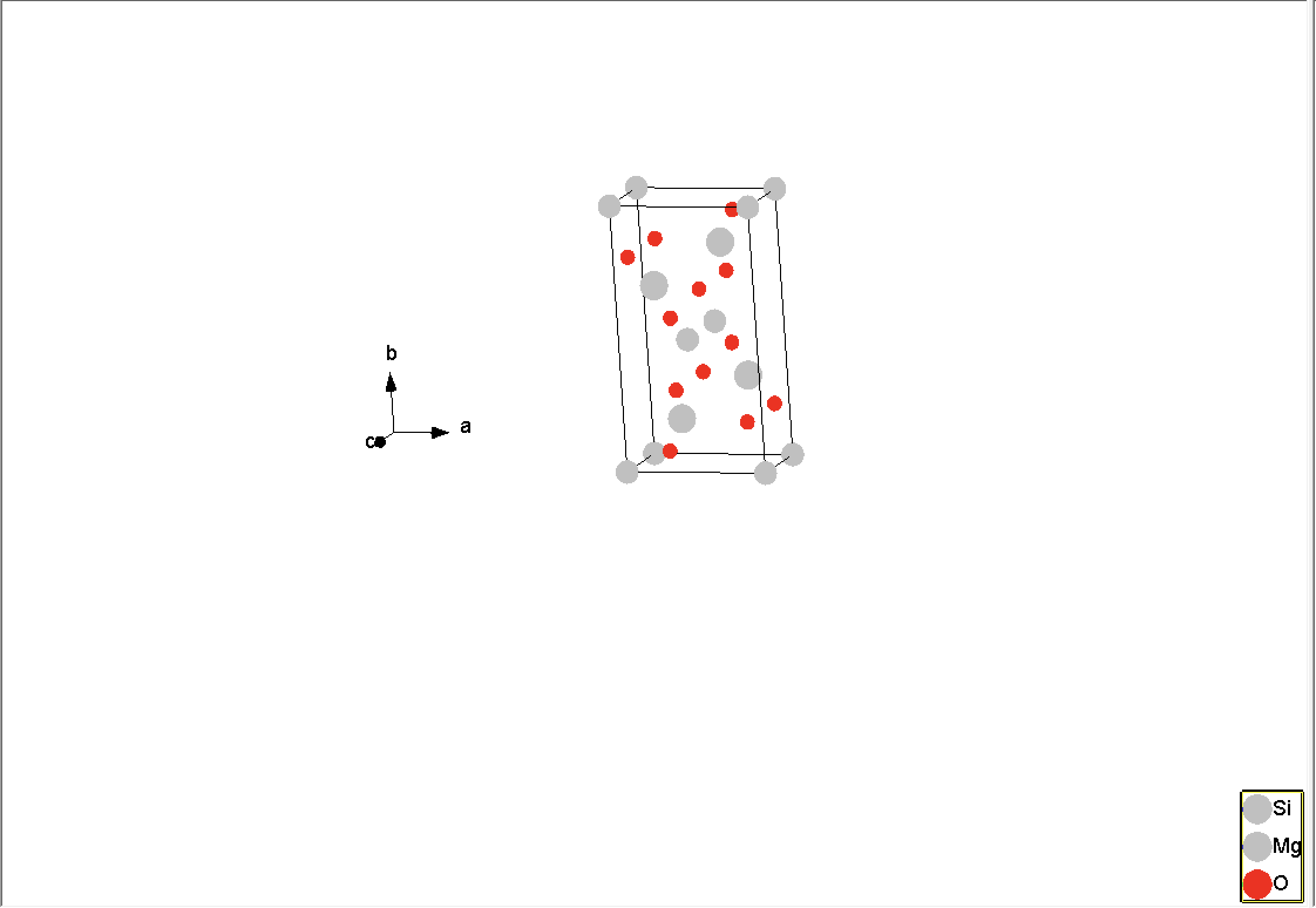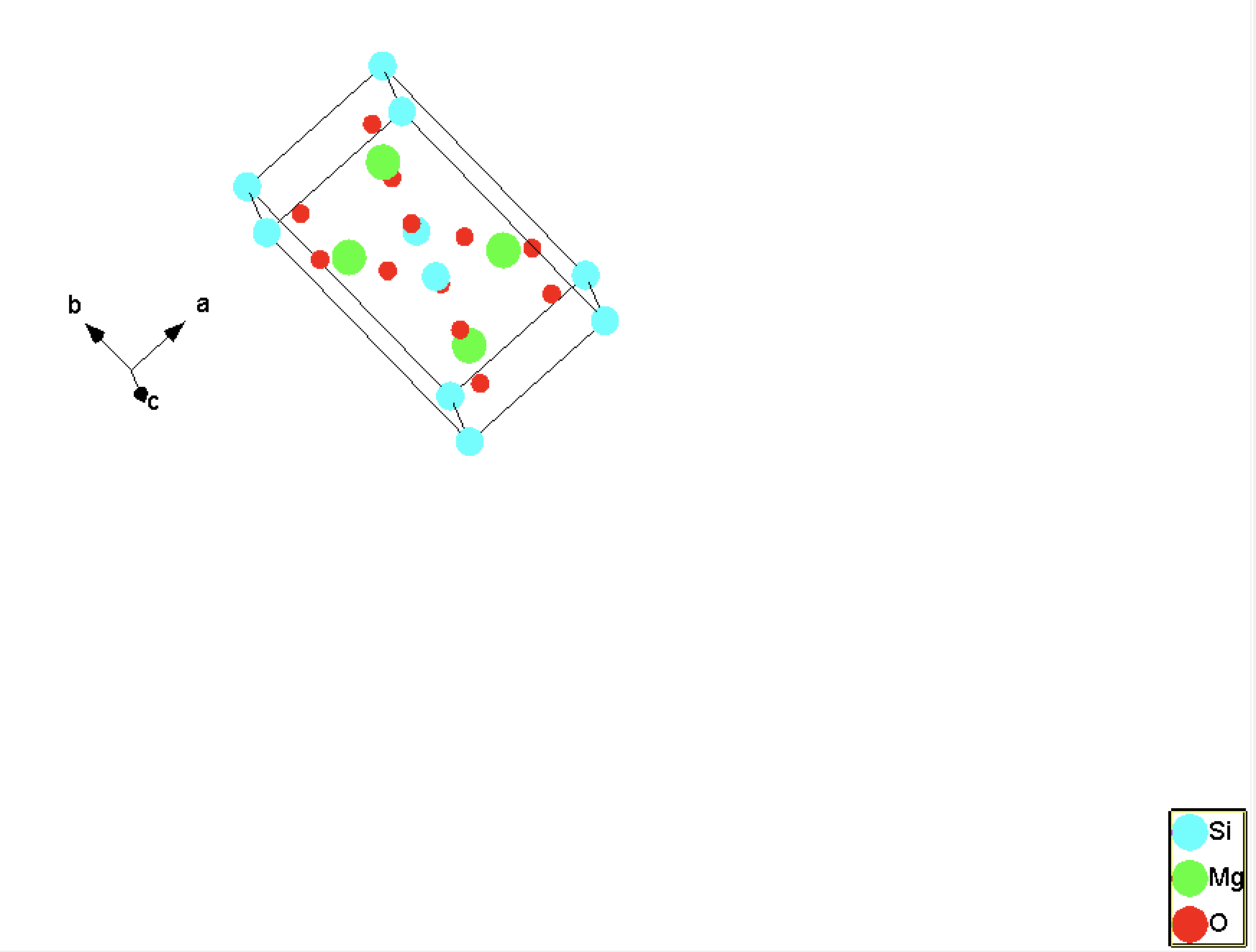 从相关晶体数据库中查找空间群为Pbam的一个化合物Mg2SiO4的晶体学数据,(1)列出晶体结构数据;(2)画出该晶体结构立体图示(背景需为白色)、以及沿[100]、[110]、[111]投影的图示。(3)说明该晶体单胞中共有多少个原子?